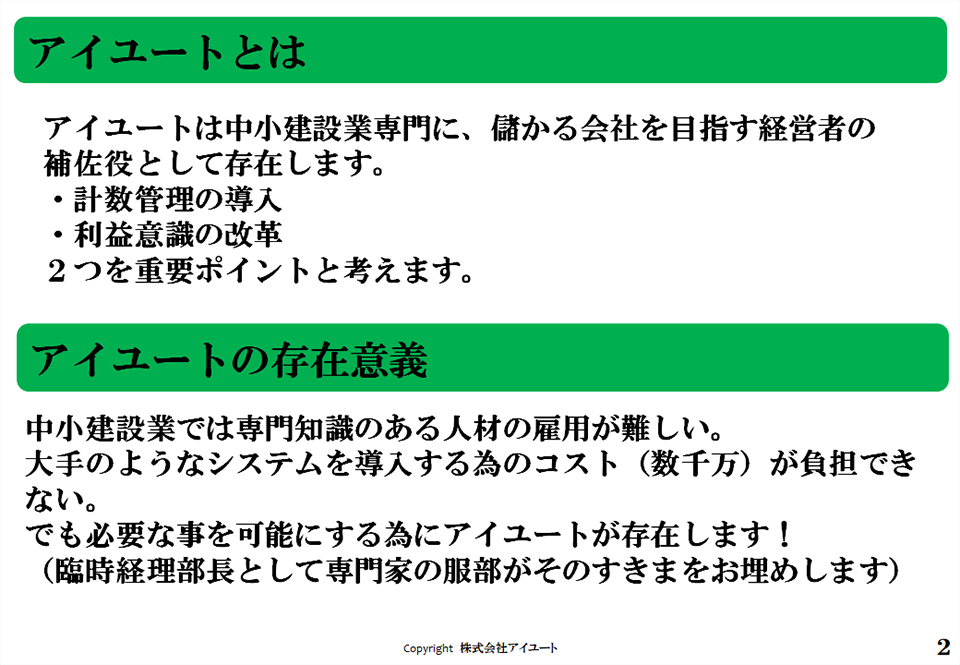 各々の会社にあった原価管理の方法や経理の改善等をコンサルタントの目線では無く、会社の臨時経理部長の目線で会社の粗利益向上のお手伝いいたします。