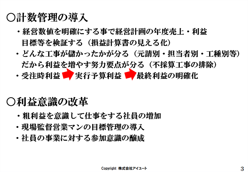 - どんぶり勘定をやめ目標管理をきちんとし、社員一丸となり利益追求する企業に変える