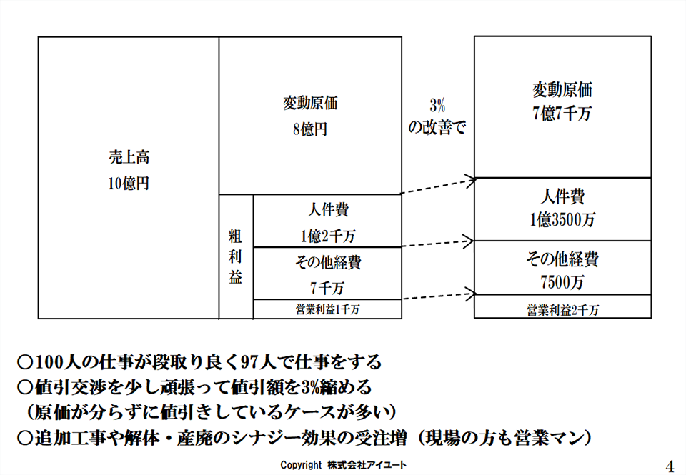 (元請先の内3社が年間通じて、赤字の取引であった事、又粗利益率に会社毎にばらつきも判明して、営業努力先を絞って営業出来るように改善)