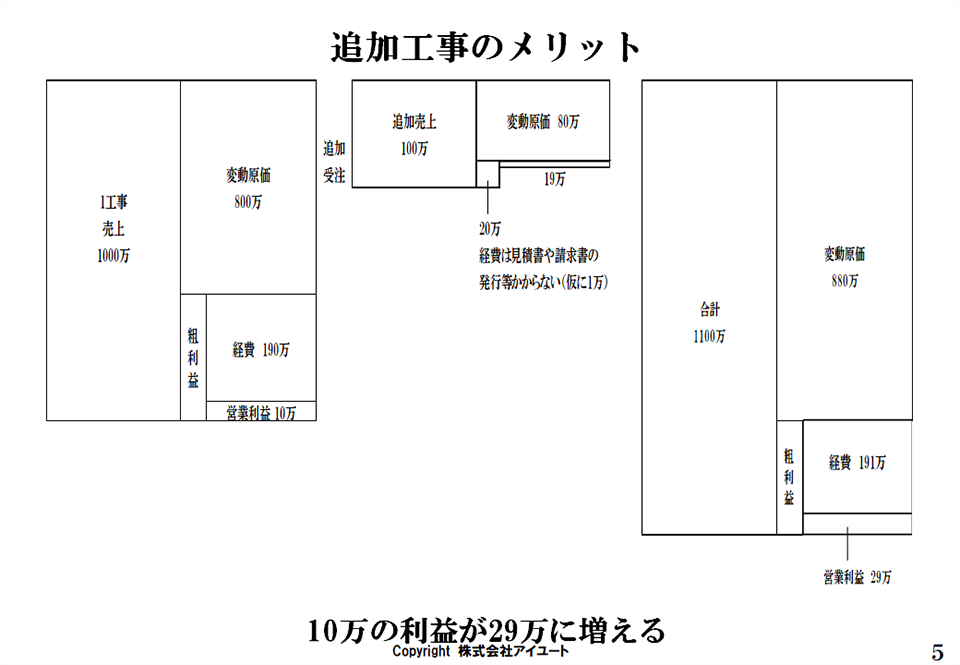 - 小規模な金額の工事が多い為、未請求の工事を防止出来る事により、完成工事高、粗利益高が増大(純益として増大)
