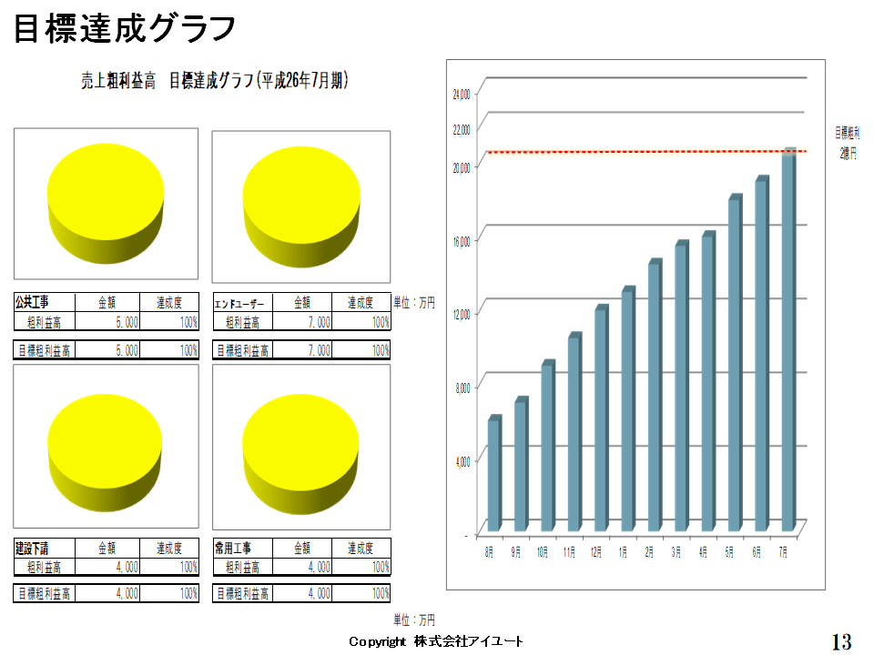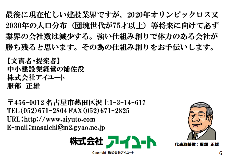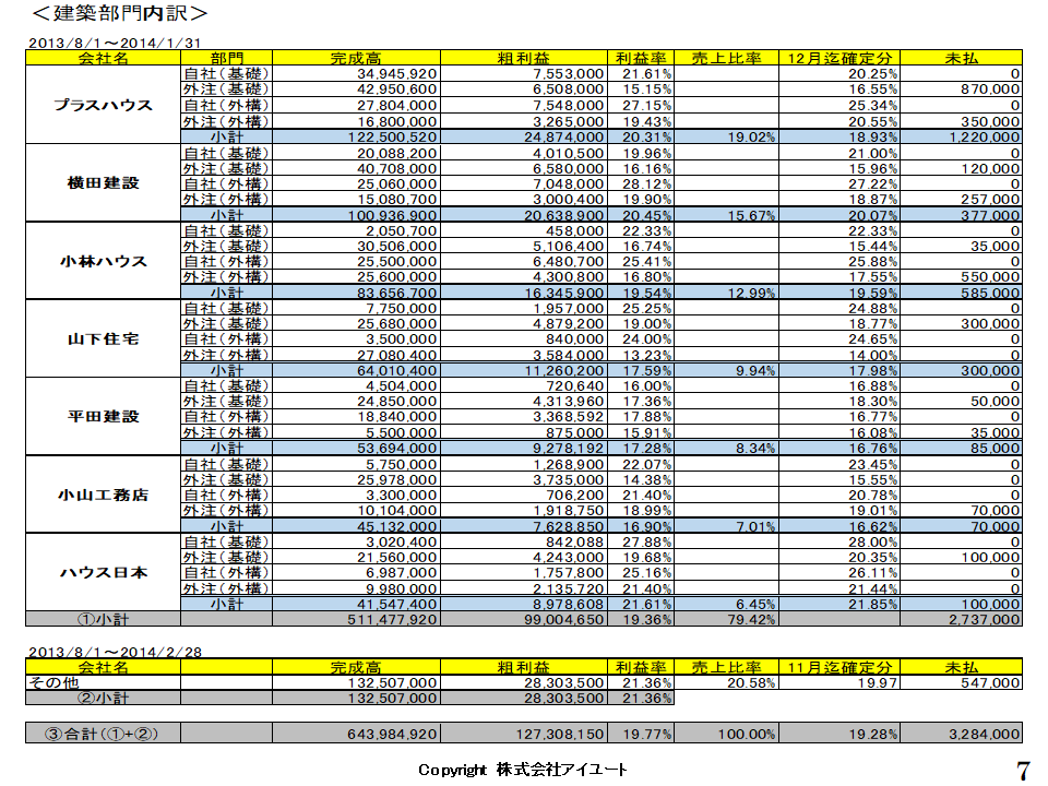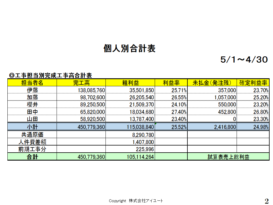 - 元請先別、担当者別の完成工事高、粗利益高、粗利益率等をオープンにして、毎月工事担当者会議を社長を交えて実施(計数管理による意識向上)