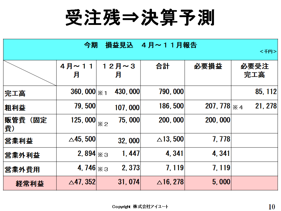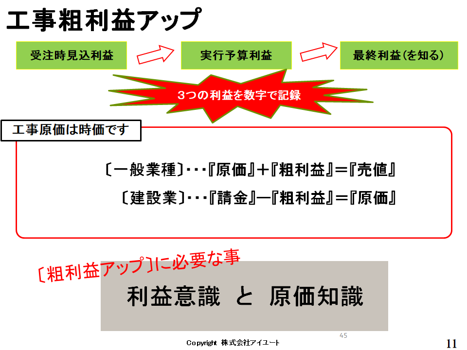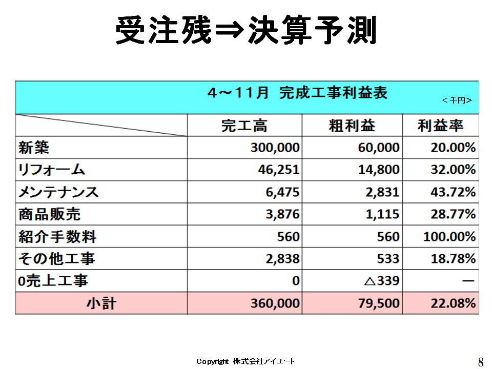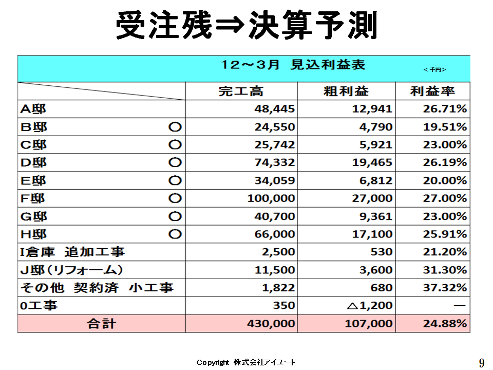 - 赤字では無くても、見込利益率が10%以下の工事は再チェツクと共に社長決裁が必要に改善。