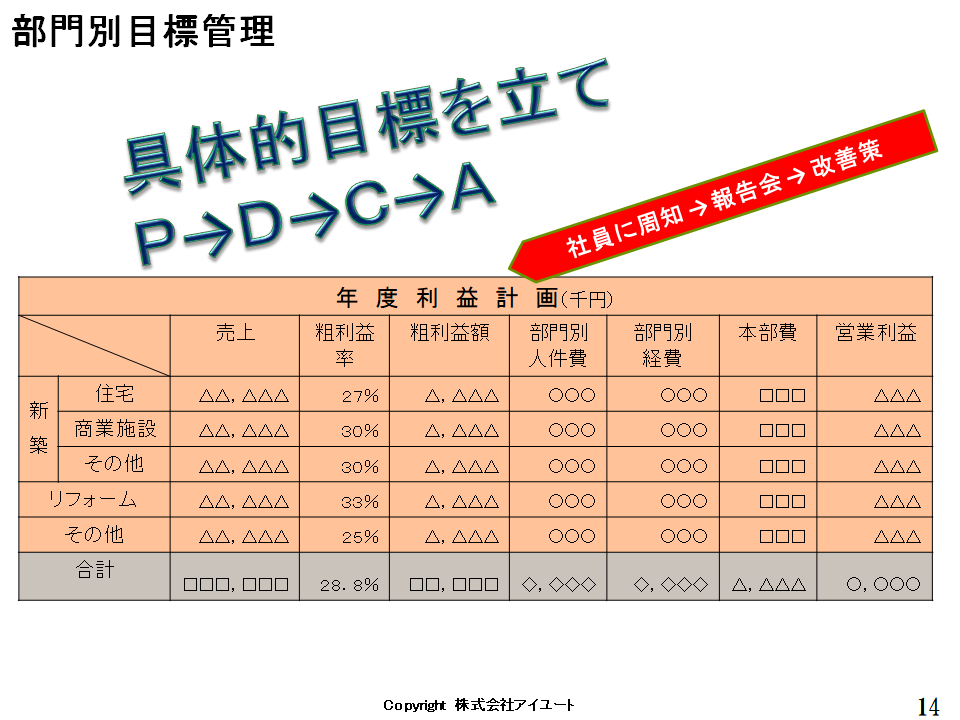 - 年度利益計画P⇒D⇒C⇒Aのサイクルで、チェツクが明確に図れる