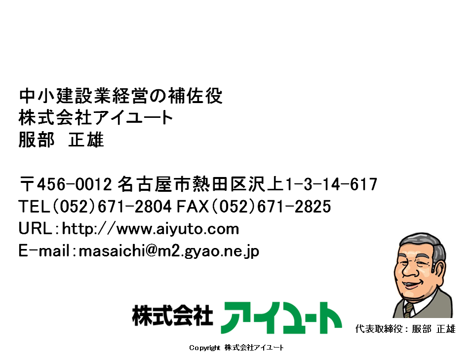 - 月次試算表の正しい作成により、経営状況の把握が正しく把握出来、決算の予測も未成工事の残高、工期把握等も含め容易に出来、借入申込時に銀行に提出する書類等も正しく提出出来、銀行信用面が増大した。