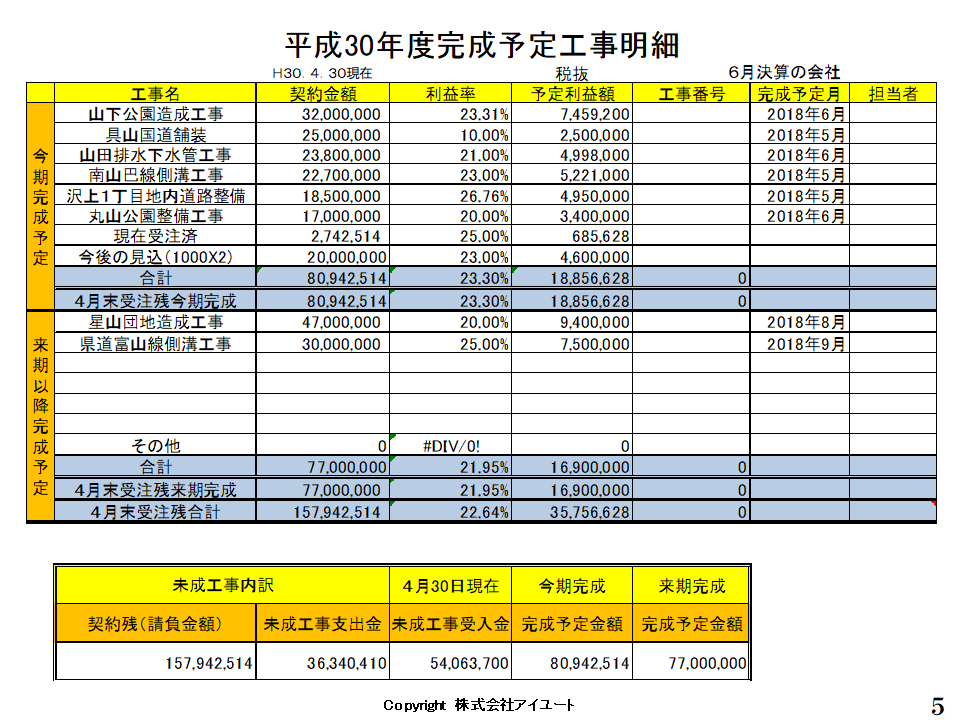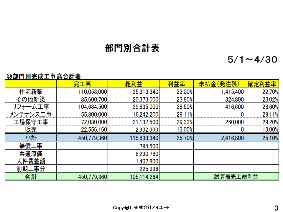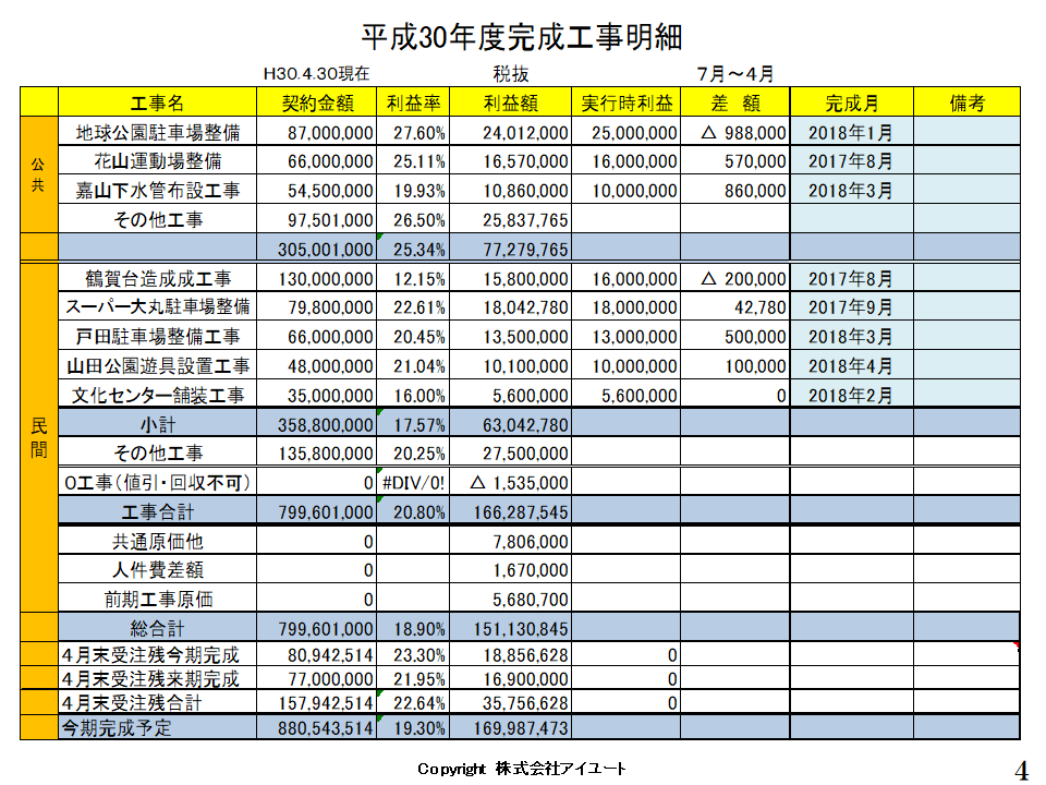 - 工事別一覧表により、毎月の完成工事高、粗利益の把握が出来た。