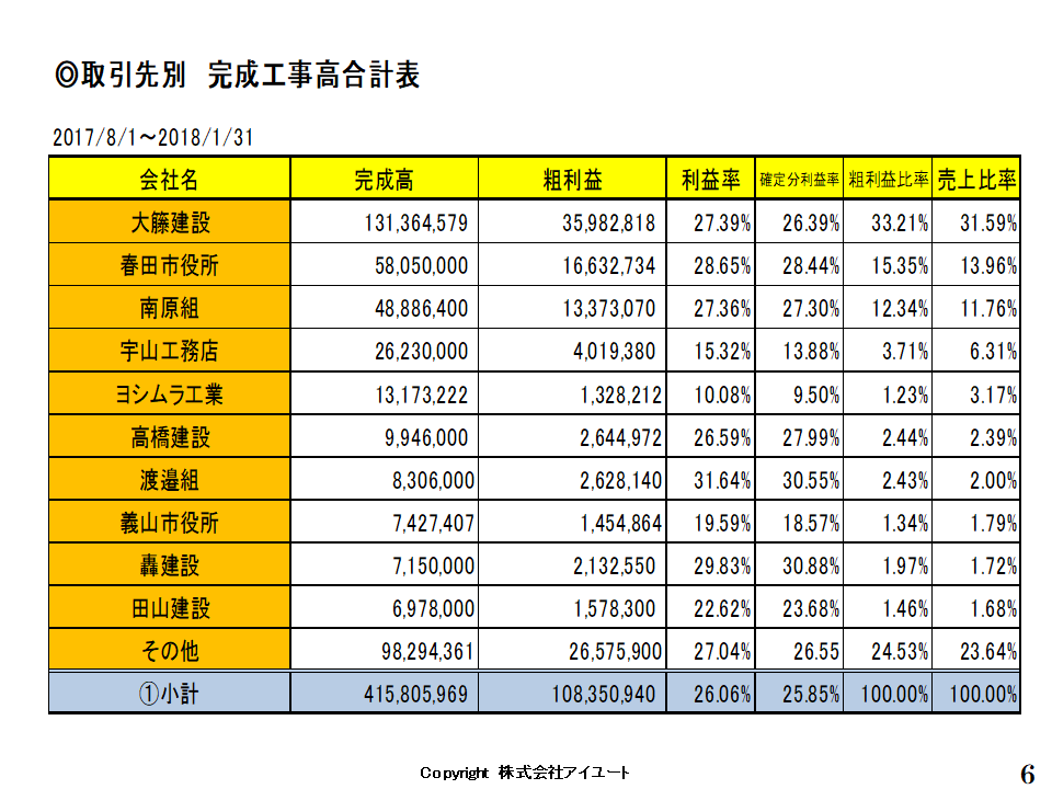 - 特に土木下請の工事が売上比率が高いが粗利益額が少ない事が判明して具体的改善に繋げた。(売上構成比42%、粗利益構成比25%)